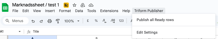 The marketing team now stages all upcoming events in a single Google Sheet (their CRM system for booking). A custom-built Google Sheets extension adds a “Publish” button in the drop-down in a meny called Triform Publisher.