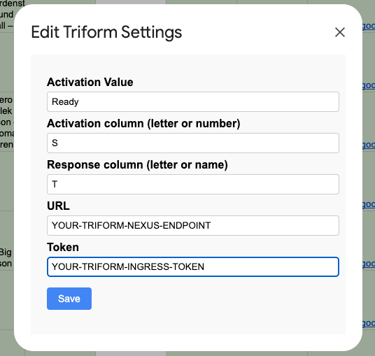 When clicked, the row’s data is sent to a Triform API Endpoint, which initiates the workflow you can also change the settings with new Endpoints and URLs.