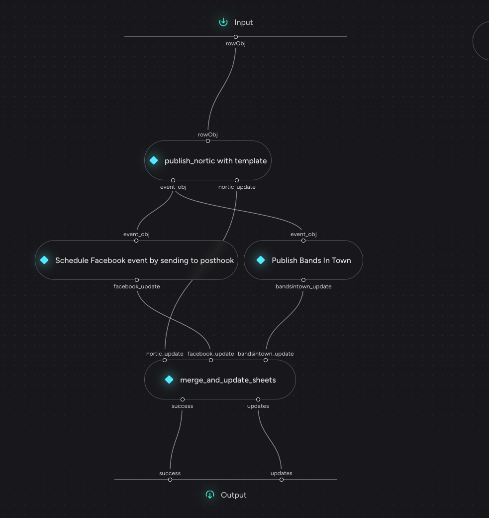 After publishing on all platforms, We call a lightweight GCP Cloud Function that updates the Google Sheet with event links and status feedback.