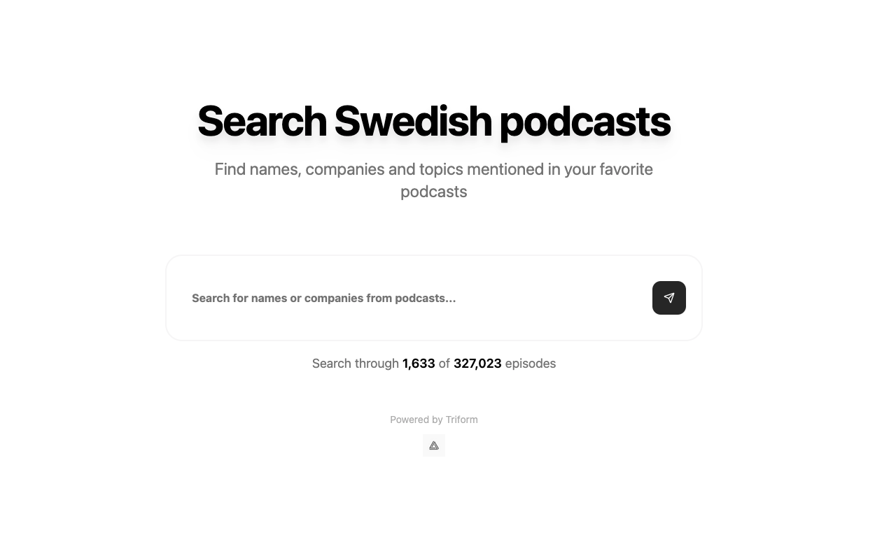 Last week, I decided to undertake a project to challenge myself: Find all Swedish podcasts, download them, and then transcribe them and build a search interface.
